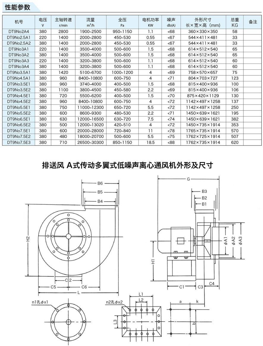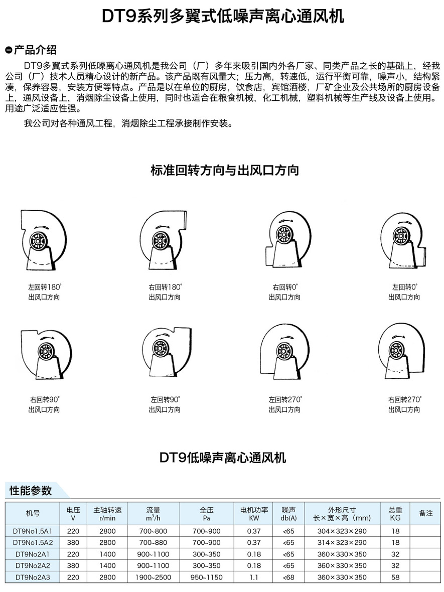 DT9多翼式系列低噪離心通風(fēng)機(jī)是我公司(廠)多年來吸引國(guó)內(nèi)外各廠家、同類產(chǎn)品之長(zhǎng)的基礎(chǔ)上,經(jīng)我 公司(廠)技術(shù)人員精心設(shè)計(jì)的新產(chǎn)品。