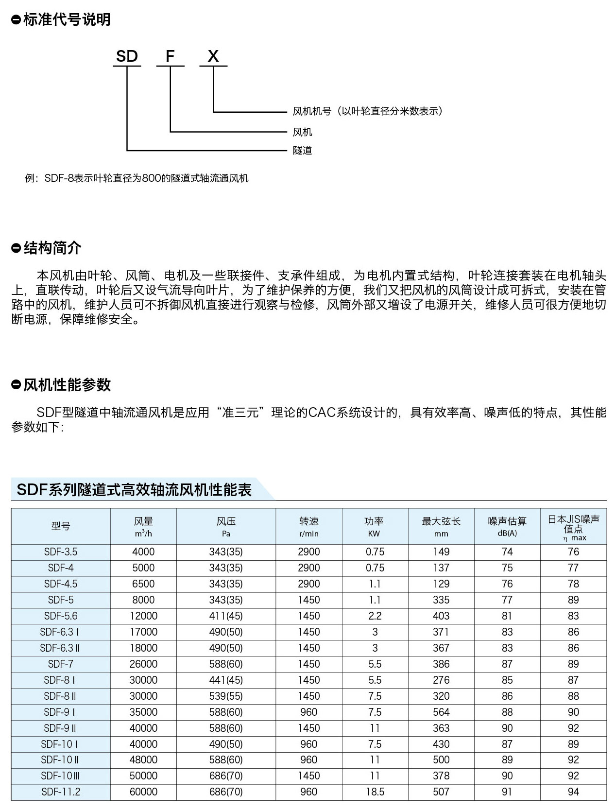 SDF系列隧道式軸流通風機主要用于地下鐵道通風換氣,亦可用于鐵路隧道、山洞及地下工程和建筑物的 通風換氣。 是一種高壓力、低噪聲、高效軸流風機。 該型風機經實測 表明,其主要技術性能指標達到了國外同類產品的水平。