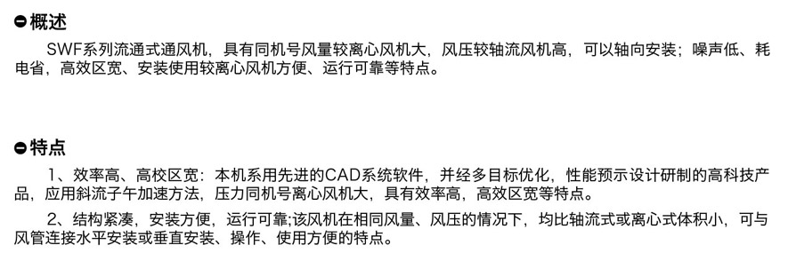 SWF系列流通式通風機,具有同機號風置較離心風機大,風壓較軸流風機高,可以軸向安裝;