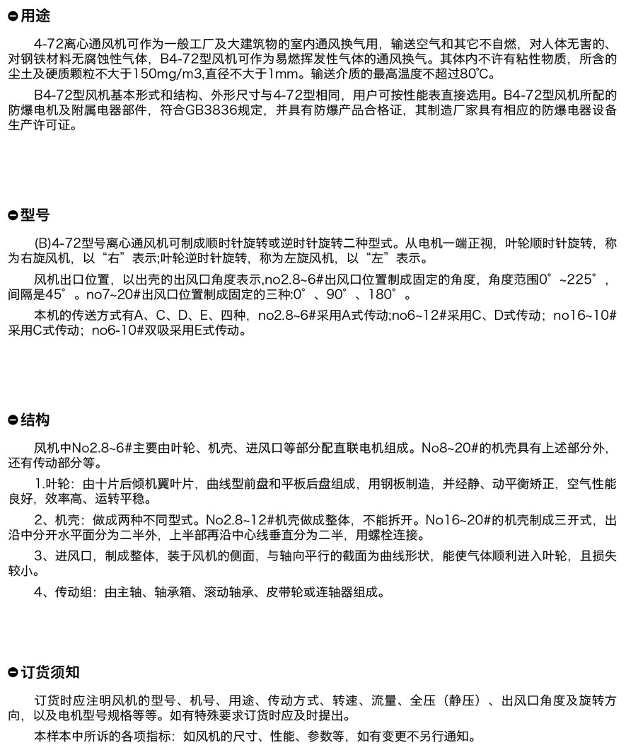4-72離心通風機可作為一般工廠及大建筑物的室內(nèi)通風換氣用,輸送空氣和其它不自燃,對人體無害的、 對鋼鐵材料無腐蝕性氣體,B4-72型風機可作為易燃揮發(fā)性氣體的通風換氣。